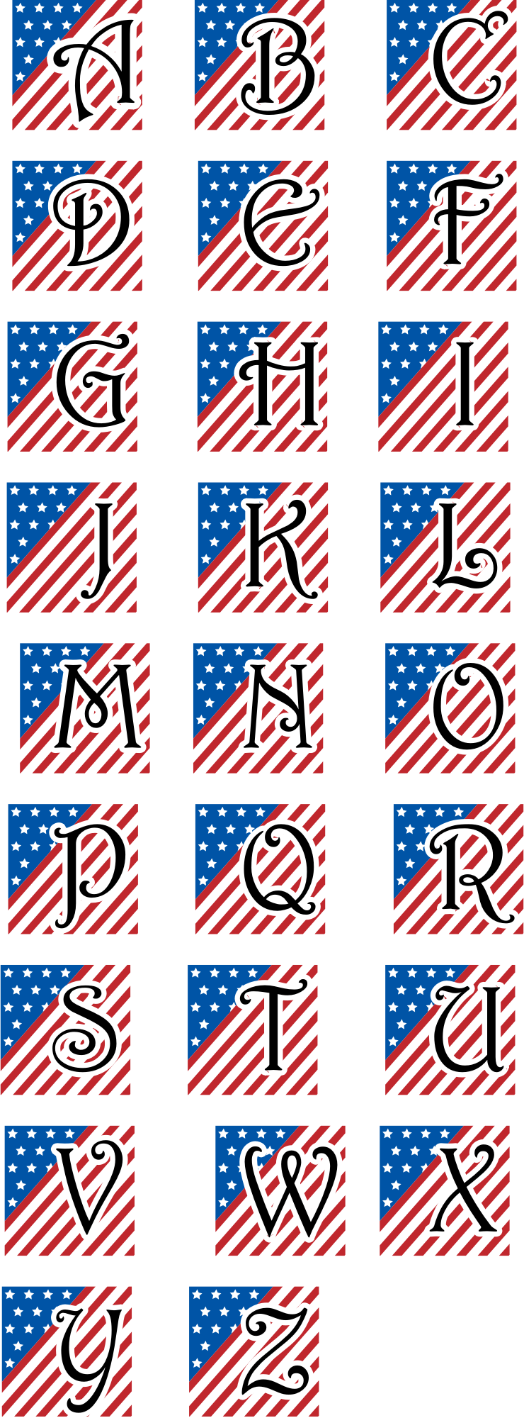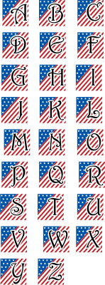 Uppercase Letters using the Harrington font with a patriotic flag background