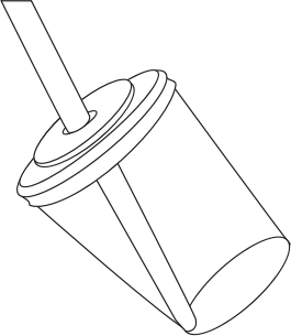 a simple disposable drink cup, somewhat tilted, with lid and straw, as black on white line drawing