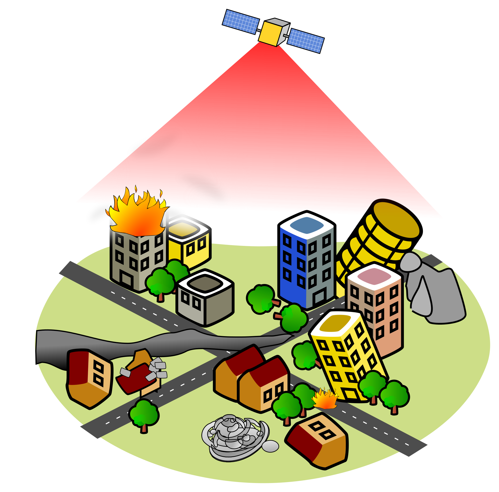 Remote sensing in emergency. Shows example of satellite monitoring of a city after earthquake.