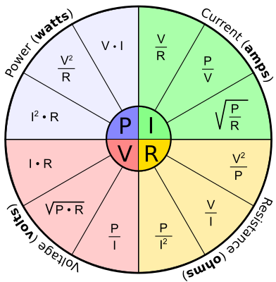 Power, voltage, current and resistance formulas.