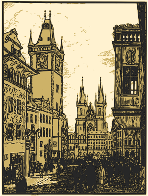 Based on a 1927 postcard by K. Vik (see http://www.orloj.eu/img/pohlednice/f/1927_K_Vik_Starom.jpg for the source). The Old Town Square of Prague. The tall tower in the left half of the image is the Old Town Hall. On the lower half of the Hall is the Prague Astronomical Clock (the horologium), though if you’re not familiar with this place, you may find it hard to find it in this image because it is facing the street.