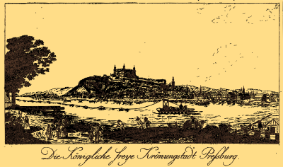 The handwritten German text at the bottom says, “Die Königliche freye Krönungstadt Preßburg” which word for word means “The Royal free Crowncity Bratislava.” This graphic was created from the public domain image at https://commons.wikimedia.org/wiki/File:Bratislava_history_01.jpg. See also https://commons.wikimedia.org/wiki/File:Bratislava_1787.jpg for a different scan of the same historical drawing, which identifies it as being from 1787.