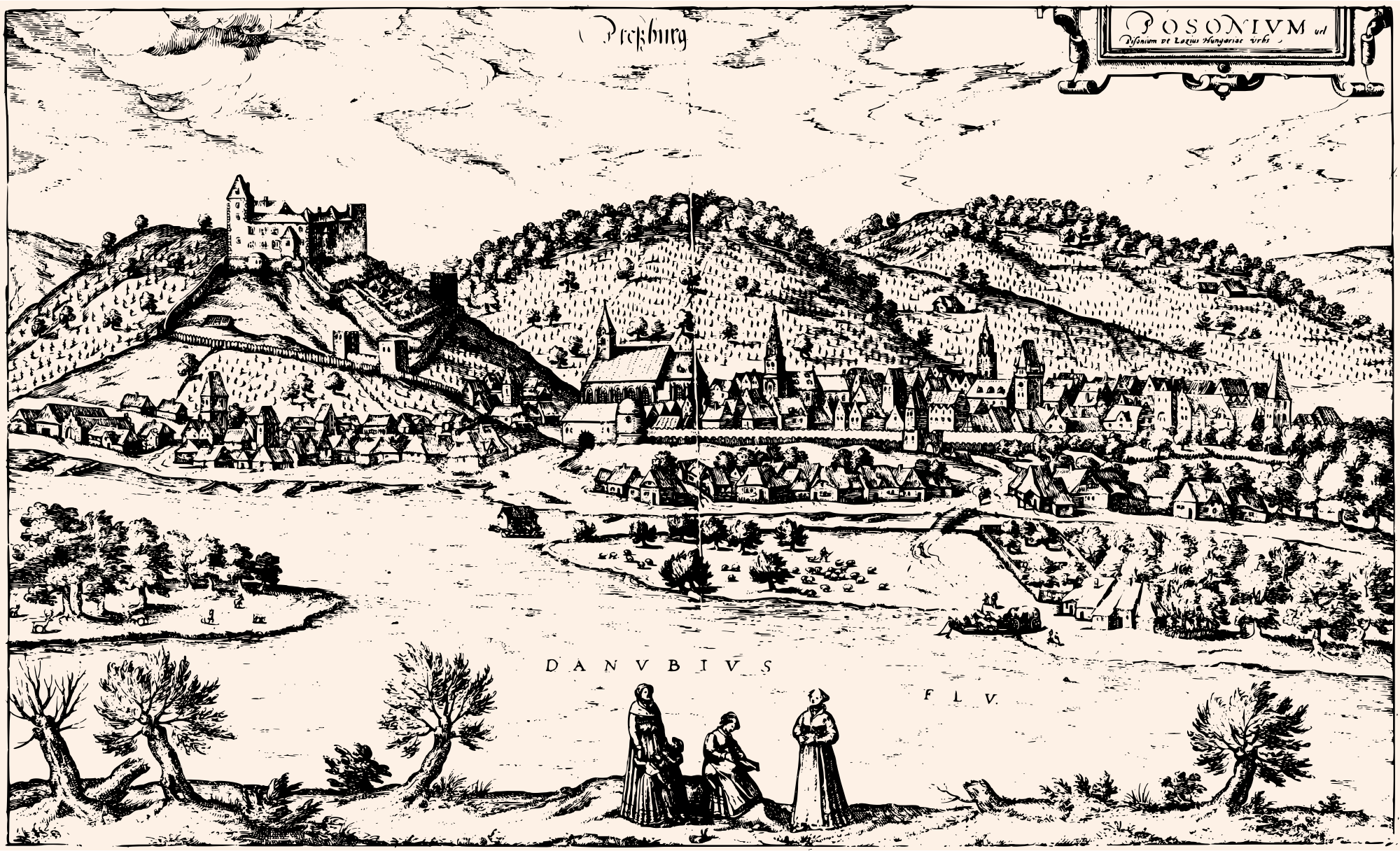 Bratislava, as Posonium (its Latin name), in the book Civitates Orbis Terrarum, Vol. IV. First Latin edition published in 1588, by Braun & Hogenberg. Source: https://commons.wikimedia.org/wiki/File:Posonium-Hogenberg-1588.jpg.