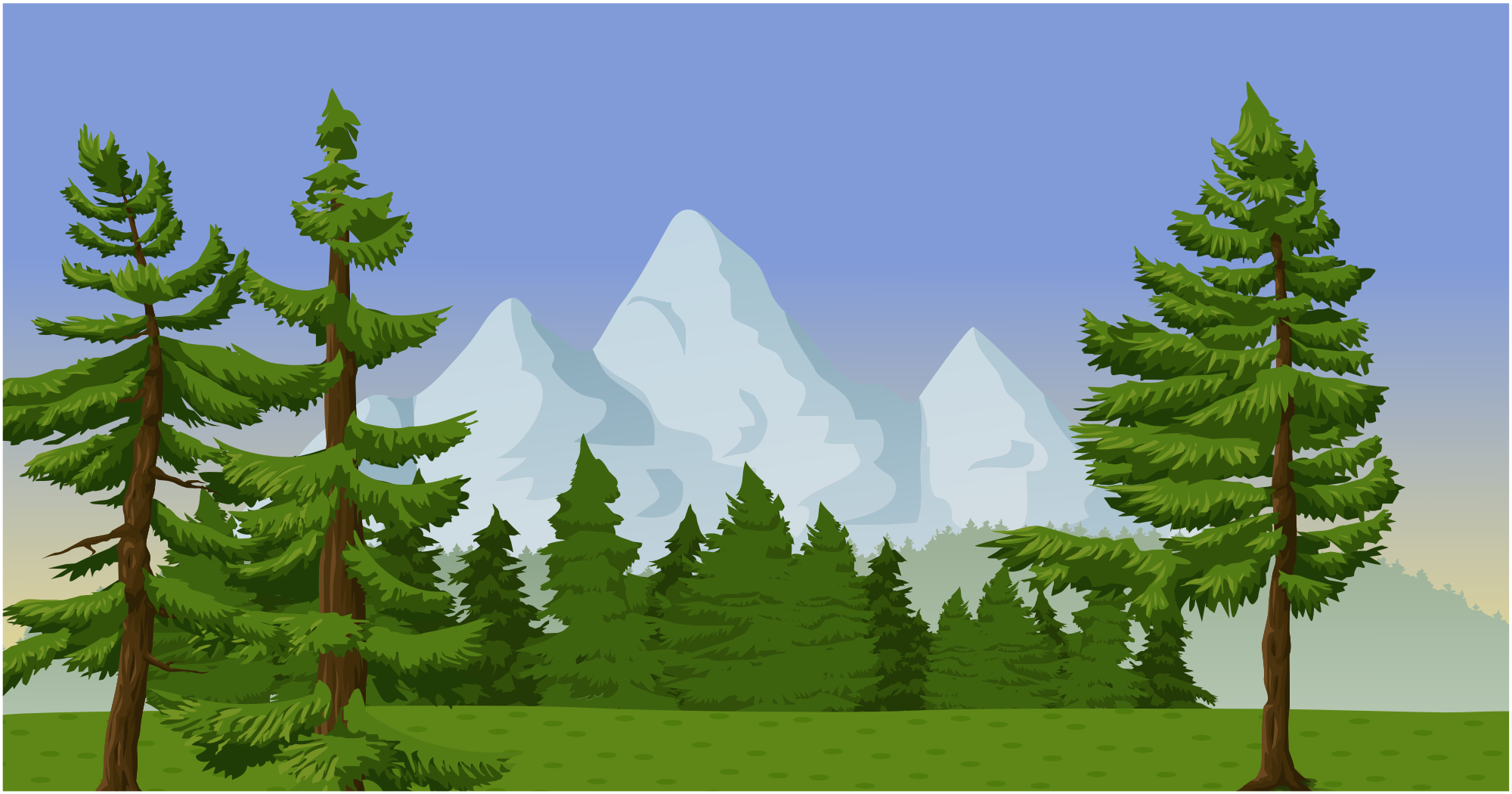 A simple outdoors scene with a grassy lawn, pine trees, and mountains in the distance. Made with artworks from Glitch (glitchthegame.com).