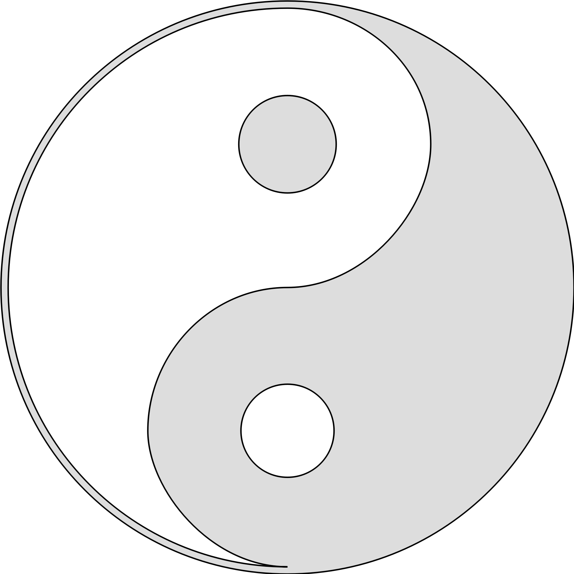 The entire graphic is drawn as a single path filled with light gray (or any other color you change the value of “fill” in line 4) and stroked with black. The other half, usually shown in white is created here as a hole in the path. That means it is completely transparent, and has whatever color its background has. To achieve this, not just with SVG but with other vector formats, any black portion of the path is drawn counterclockwise, any “white” portion clockwise. Stroking the paths shows how exactly a one-piece graphic is constructed. Fonts generally require the designers to use the all-one-piece-with-no-overlap method.
