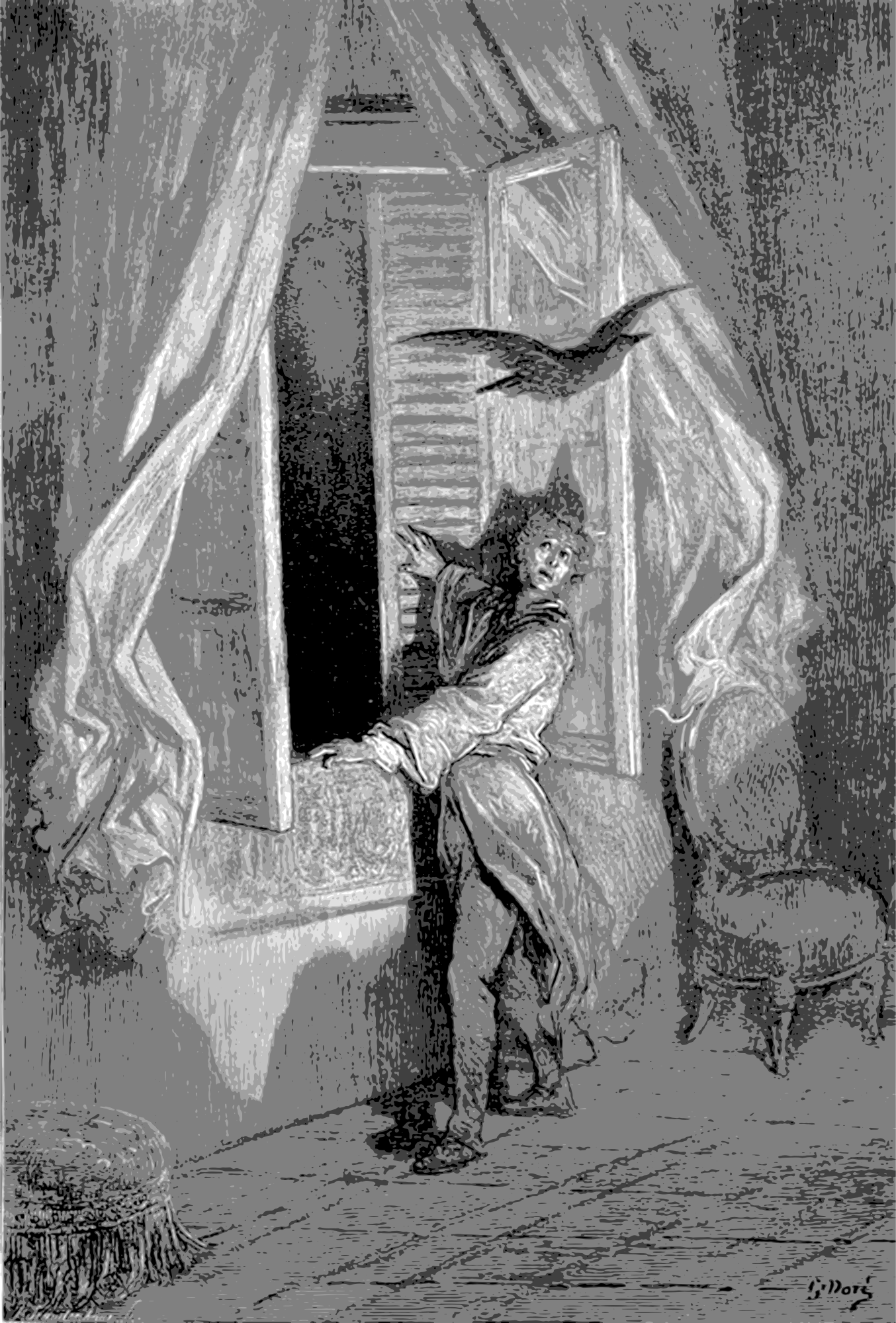 Illustration 14 for “The Raven” by Edgar Allan Poe for the line “Not the least obeisance made he.” Gustave Doré, 1884.https://en.wikipedia.org/wiki/File:Paul_Gustave_Dore_Raven14.jpg