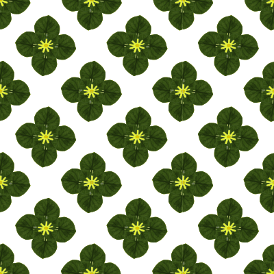 The image depicts a seamless pattern of an imaginary plant which has a yellow flower and dark green leaves.