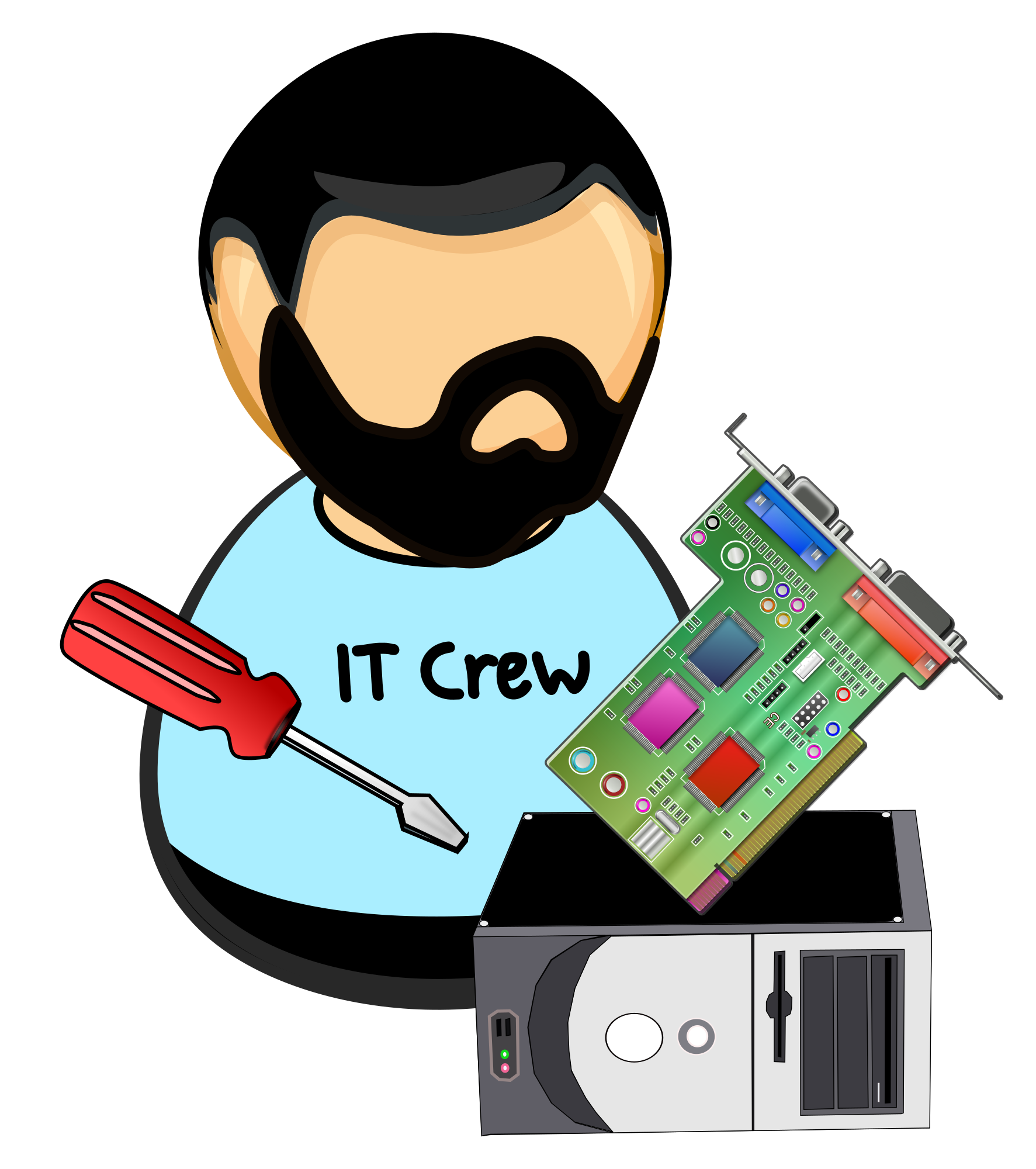 Simplified icon of an IT guy - hardware technician with an desktop PC, some card and screwdriver