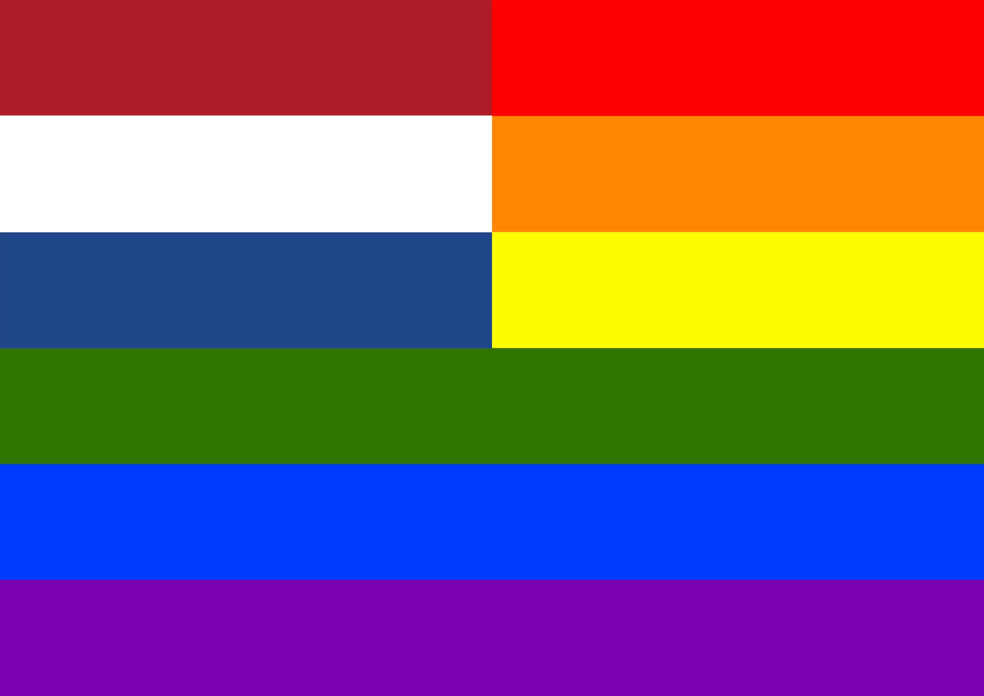 Flag of the Netherlands in front of rainbow flag.