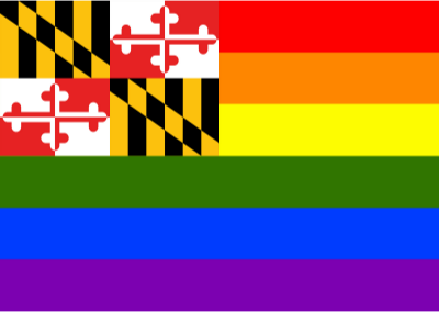 Flag of Maryland in front of rainbow flag.