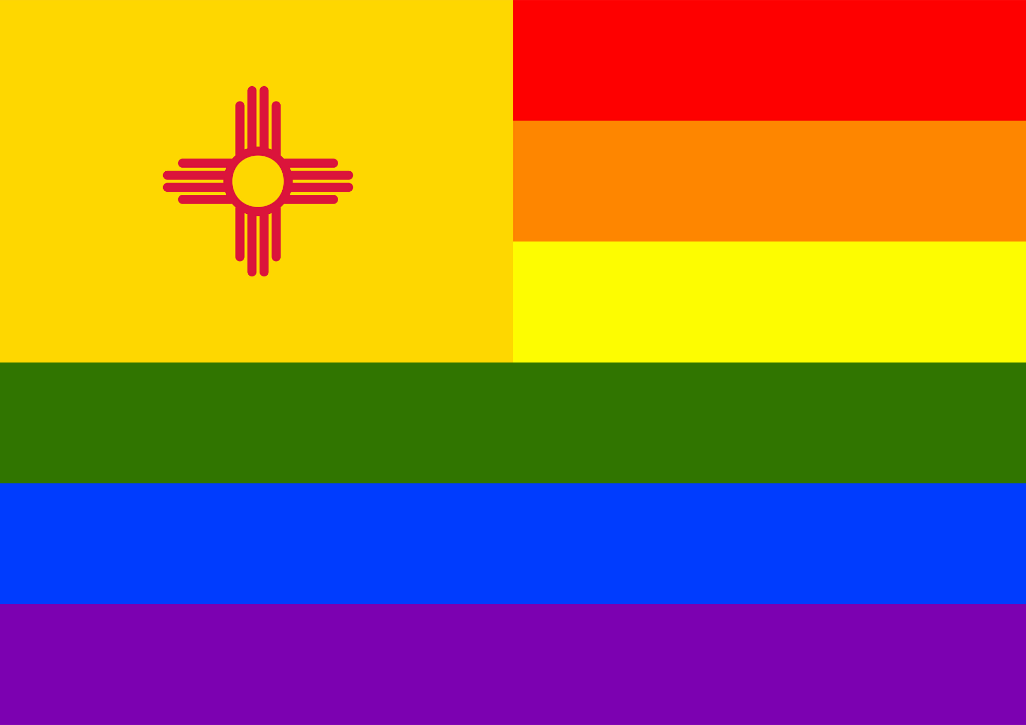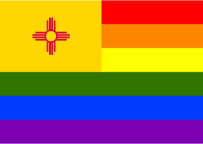 Flag of New Mexico in front of rainbow flag.