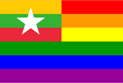 The flag of Myanmar superimposed over the Rainbow Flag.
