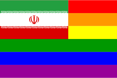 The flag of Iran superimposed over the Rainbow Flag.