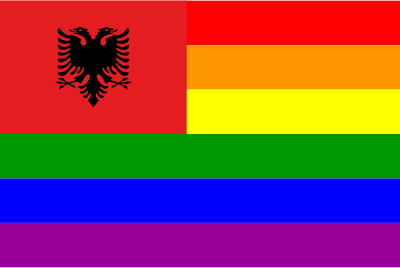 The flag of Albania superimposed over the rainbow flag.