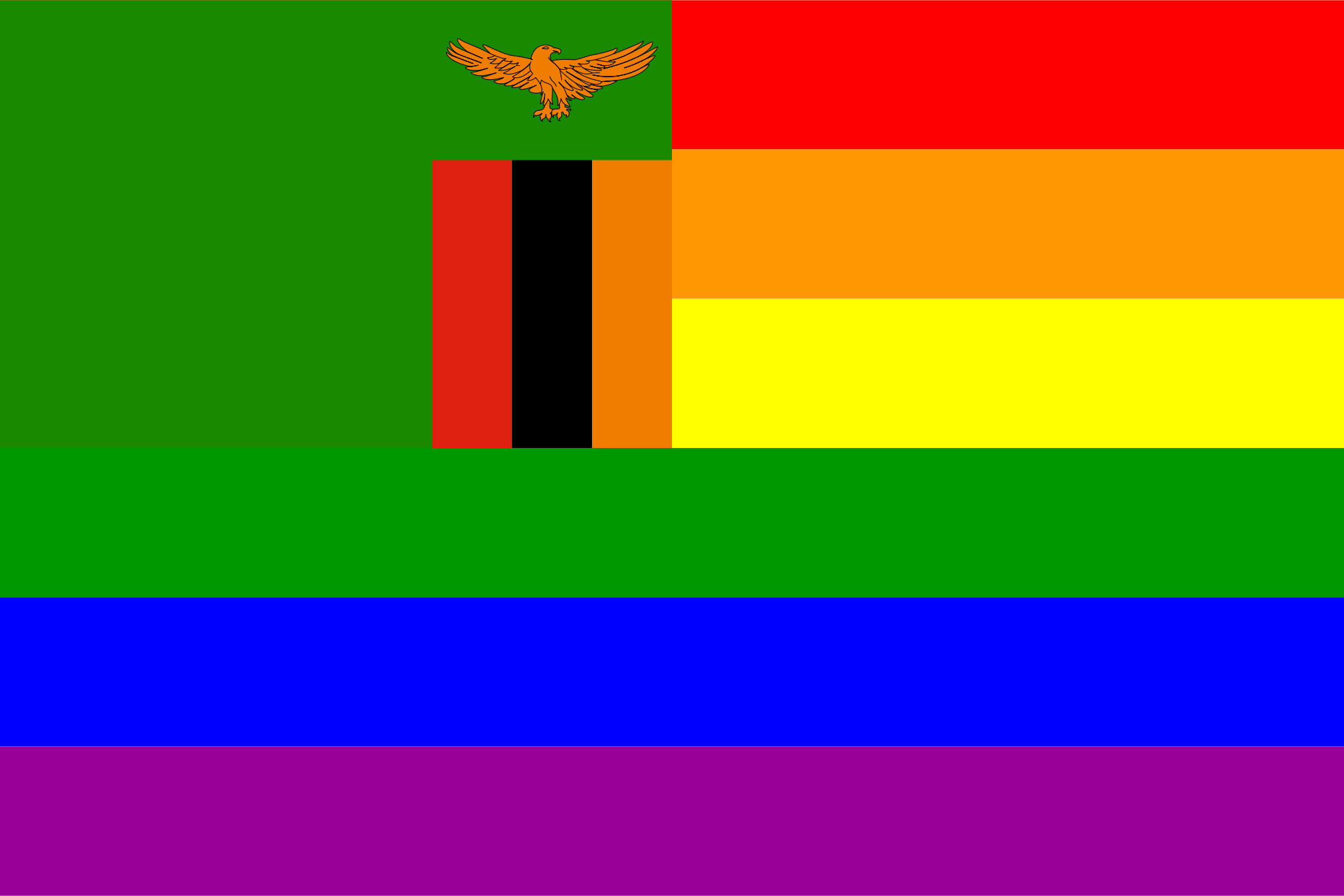 The flag of Zambia superimposed over the rainbow flag.