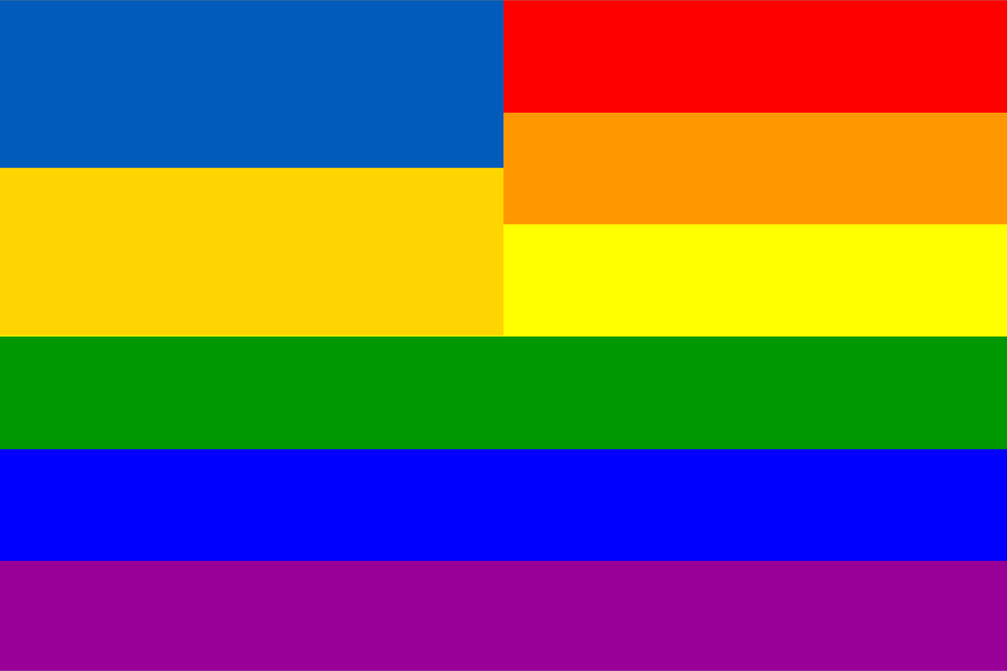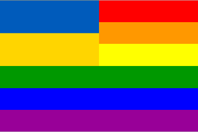 The flag of Ukraine superimposed over the rainbow flag.