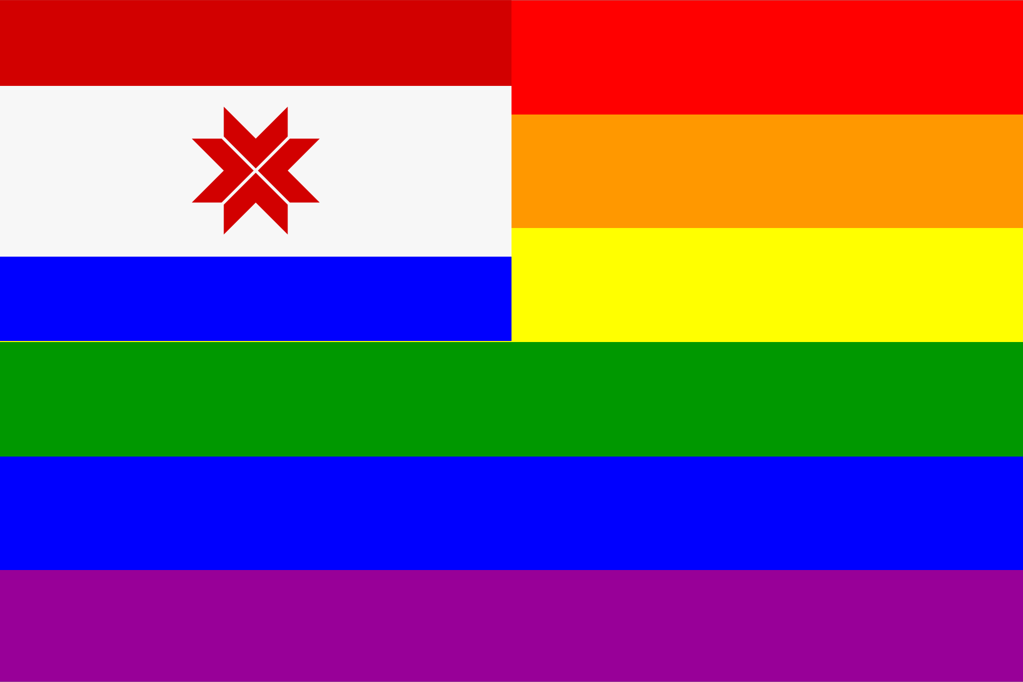 The flag of Mordovia superimposed in front of the rainbow flag. Based on the specifications found at https://ru.wikipedia.org/wiki/Флаг_Мордовии (in Russian).