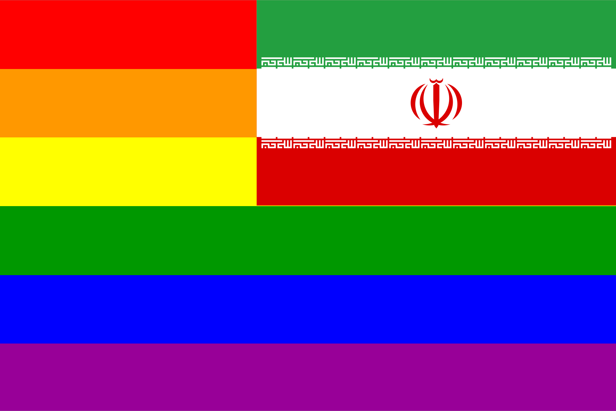 The flag of Iran superimposed in front of the rainbow flag. This is a remix to correct the original, made after I noticed “Each flag is depicted as if the flagpole is positioned on the left of the flag, except for those of Iran, Iraq, and Saudi Arabia which are depicted with the hoist to the right” mentioned at https://en.wikipedia.org/wiki/Gallery_of_sovereign_state_flags (all this time, too).