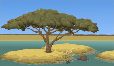 An arid landscape with shallow water and a tree. The artwork is from Glitch (glitchthegame.com).