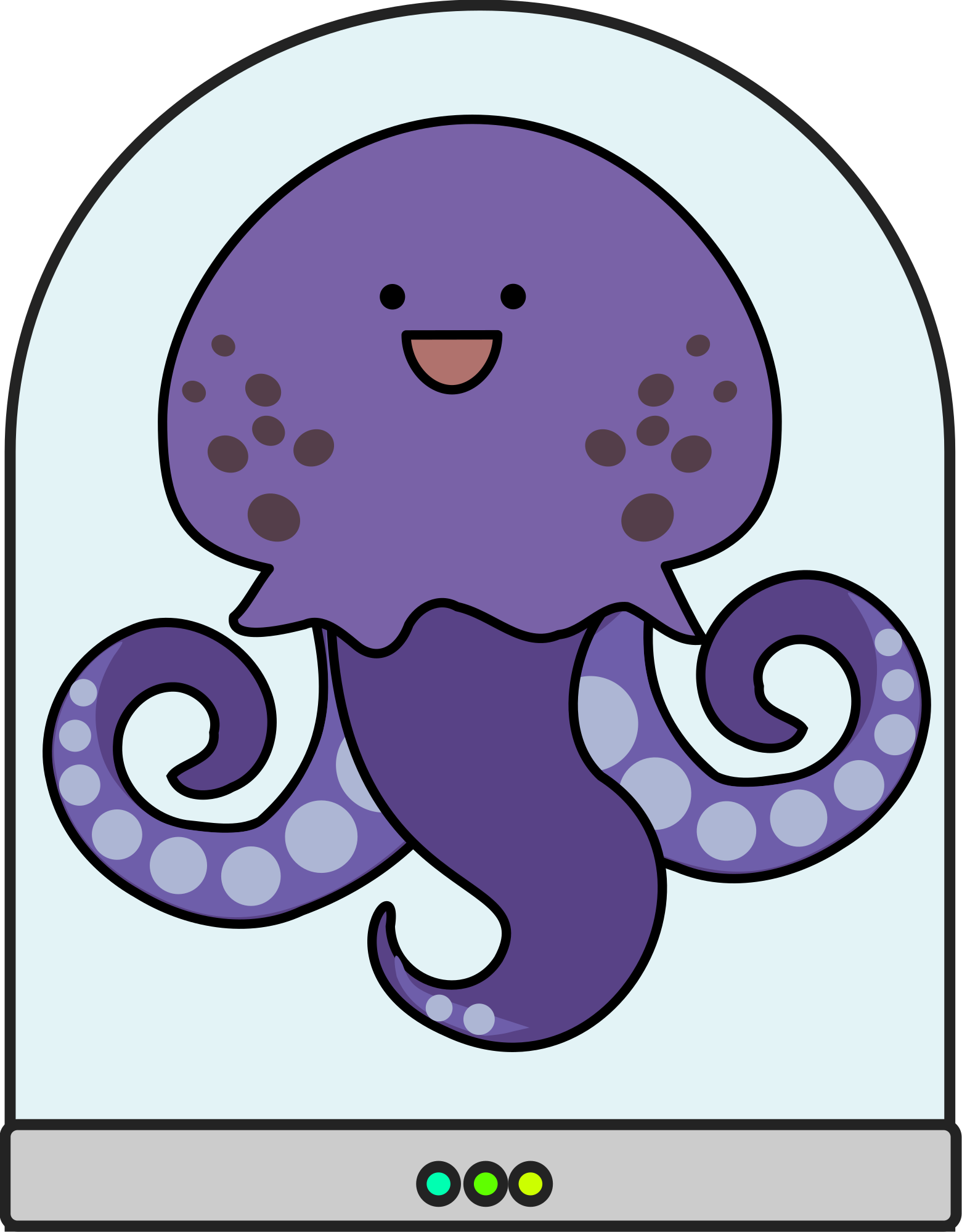 A silly comic alien creature with tentacles, inside a transparent tank, with a cheerful expression.