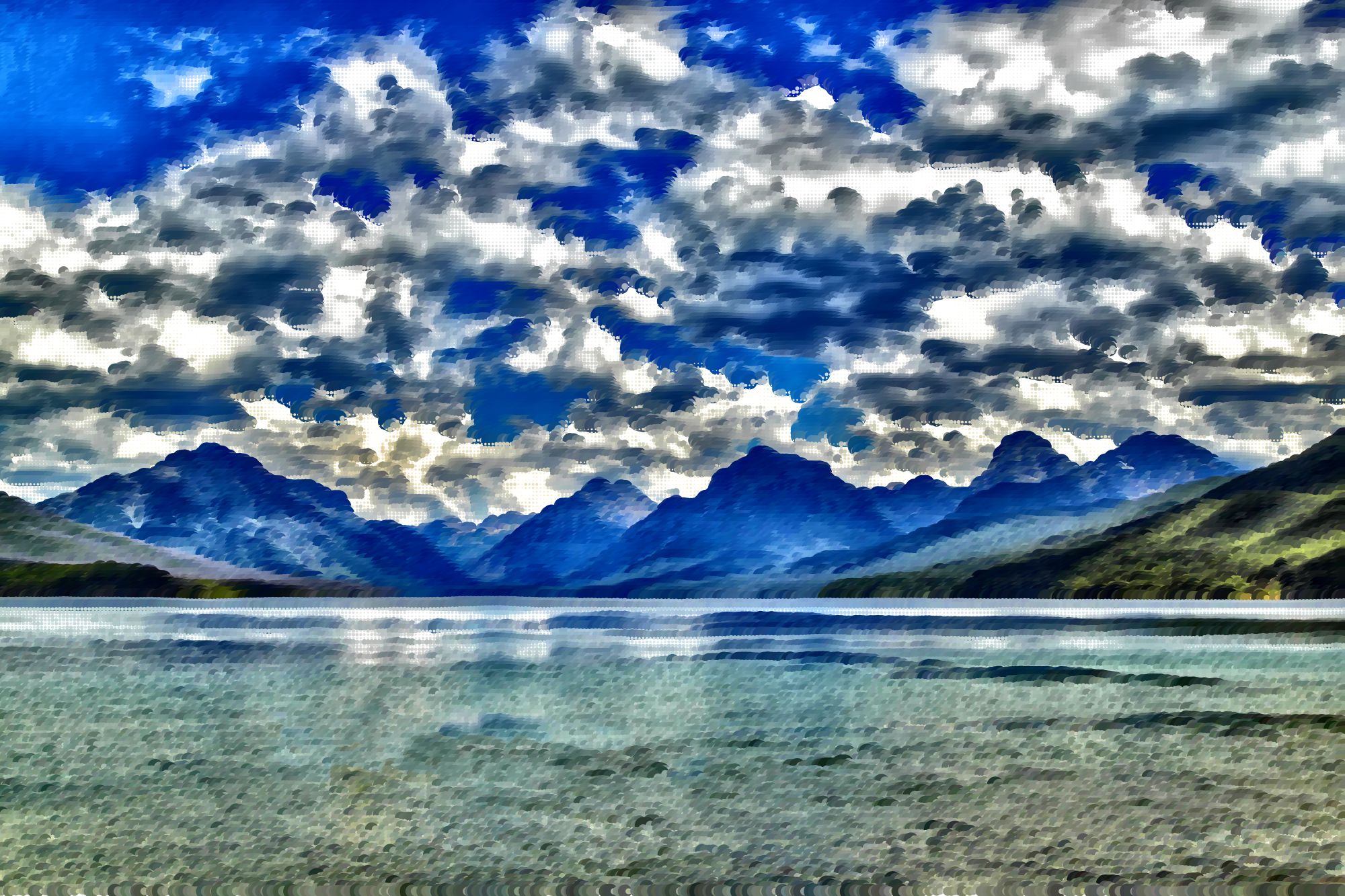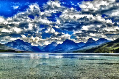 Surreal Lake McDonald Montana derived from https://pixabay.com/en/lake-mcdonald-landscape-kayaking-1583657/