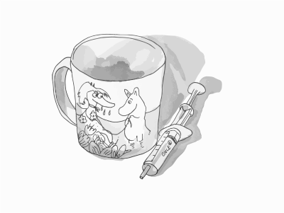 Moomin character cup and a syringe