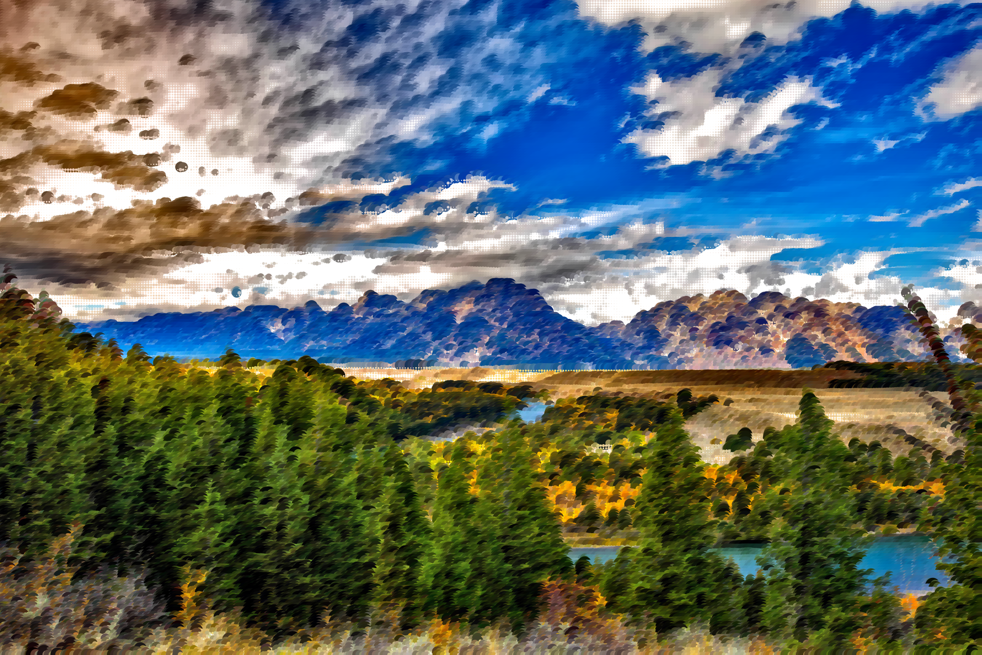 - Abstract America Art Circles Clouds Dots Forest Geometric Grand Tetons Hills Landscape Mosaic National Park Nature Photograph River Sky Source+Pixabay Surreal USA Water Wyoming