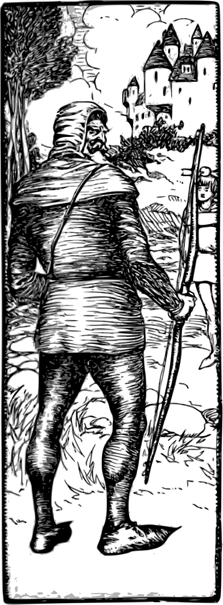 Grayscale version of William Tell illustration from 1905 book "An Alphabet of History" by Wilbur Dick Nesbit; openlibrary.org/b/OL7159266M