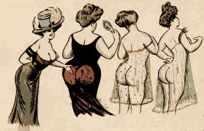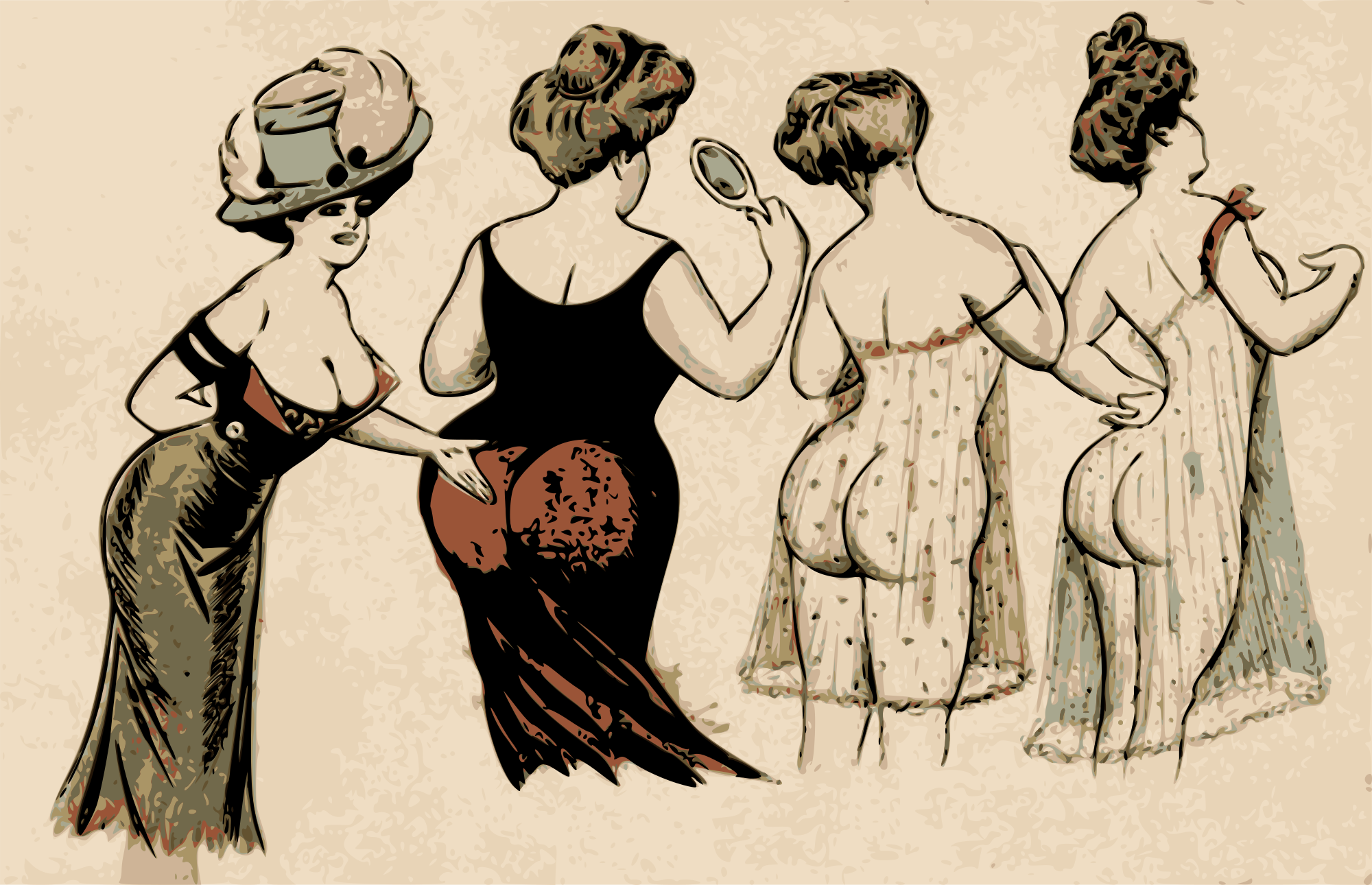 This isn't that shocking to modern eyes I suppose but these were sold to tourists a 100 years ago or so as "postcards" but you couldn't have mailed them because they would have of course been confiscated by the post office. This one lady is like showing the large bums of the other ladies. Body pride!