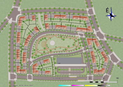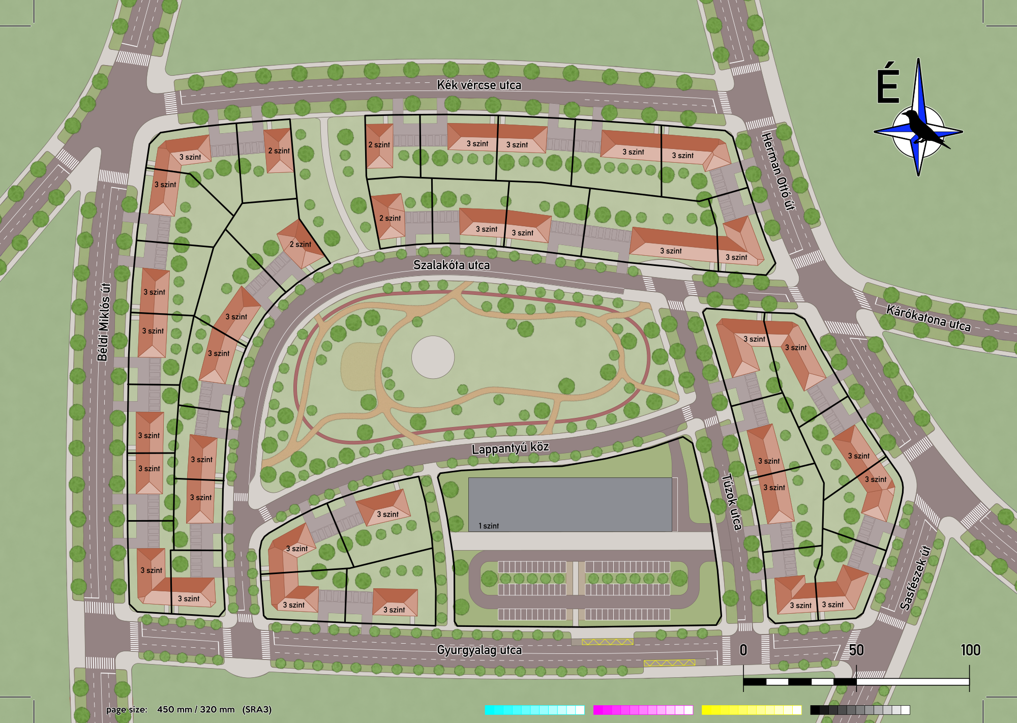 A site plan of a few building blocks in the fictionary city of Harkálybattyán, showing the planning of the "Szalakóta lakópark" (roller subdivision).