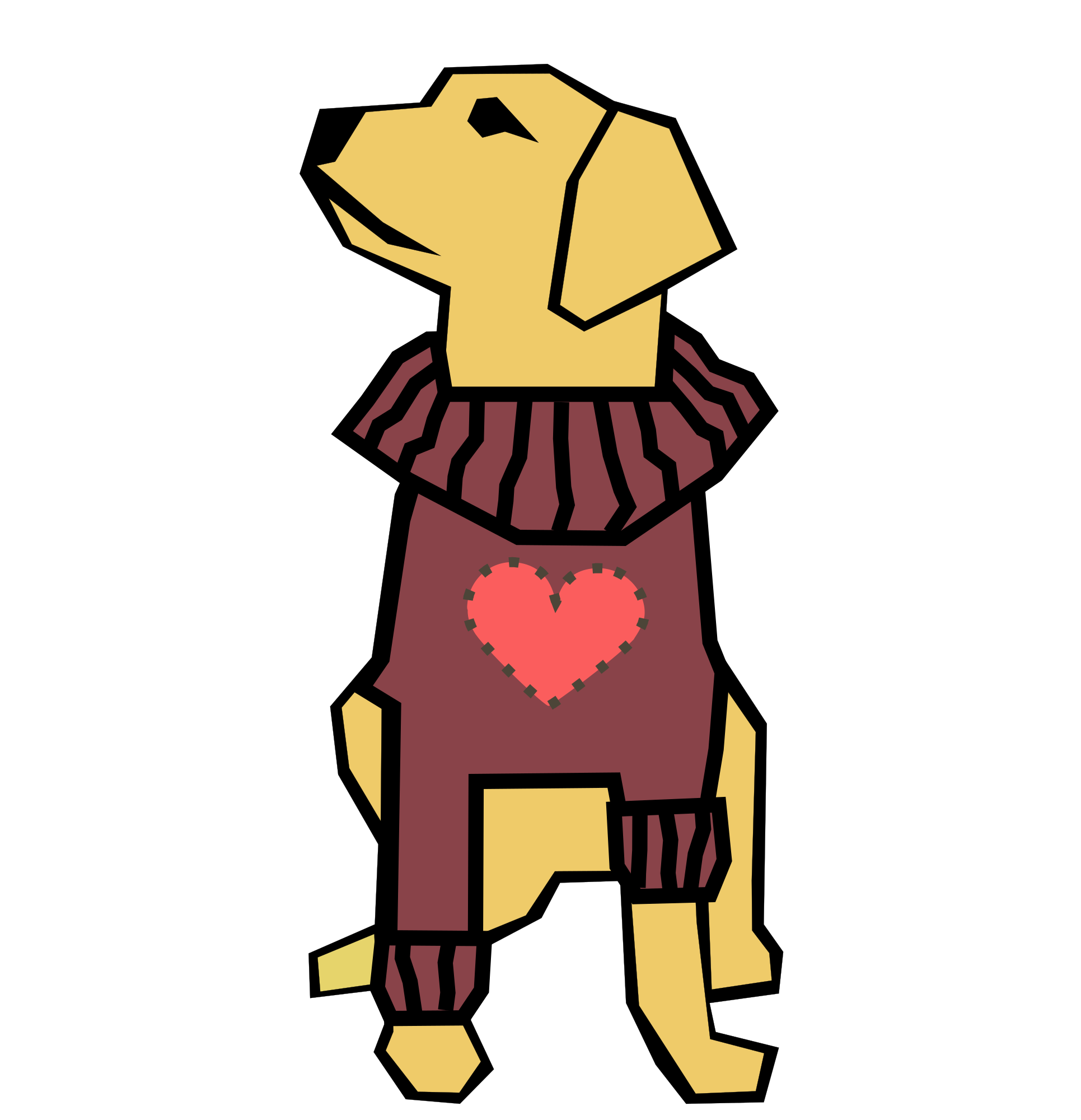 A yellow dog wearing a sweater with a big red heart on it.