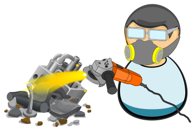 Simplified icon of a scrapyard worker with safety goggles, respirator and an electric metal grinder