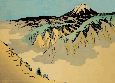 1859 illustration by Utagawa Hiroshige in 'One Hundred Views of Mount Fuji'. Stitched together the two halves on different pages of the original book and hid the seam. Covered up the shaped corners, removed the border and made the sky look more realistic.
