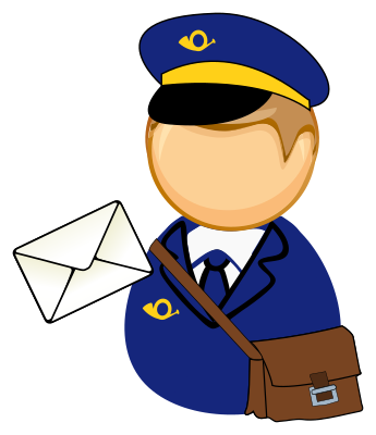 Simplified icon of a postman with envelope and shoulder bag.