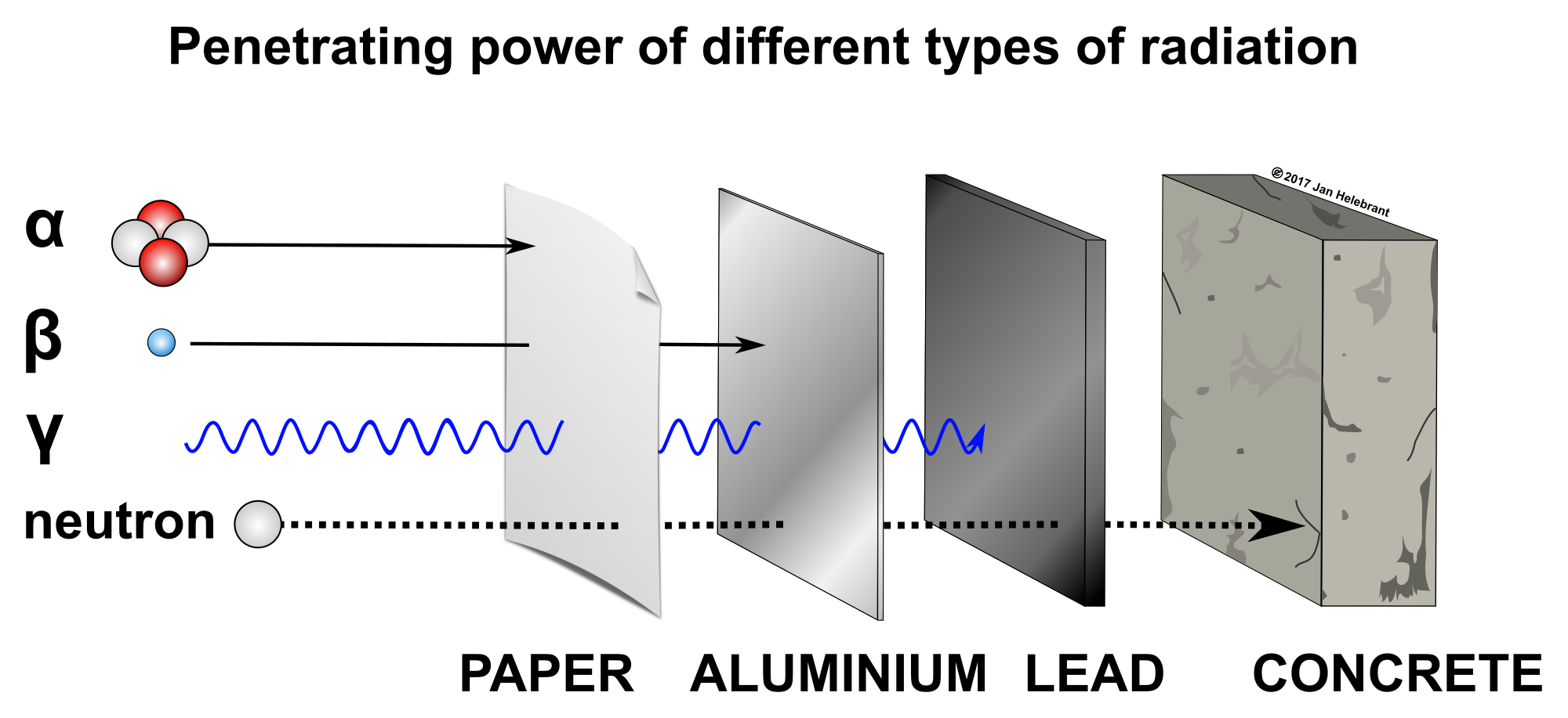 - radiation radioactivity alpha beta gamma helium neutron paper aluminium lead concrete wall shielding penetrate penetration energy nuclear radioactive