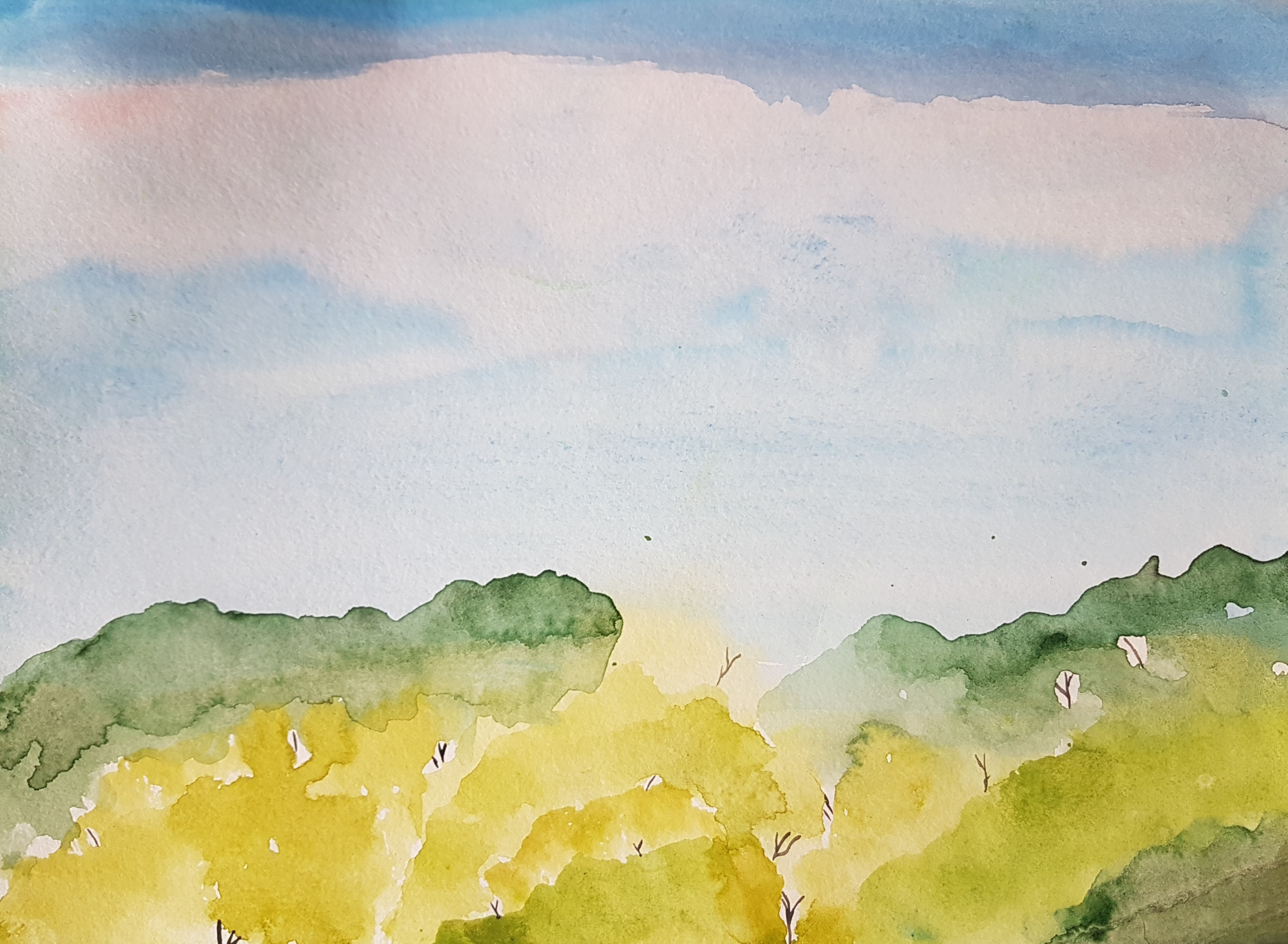 Overcast sky and the forest canopy. Water color.