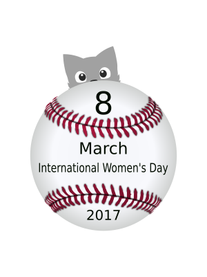 The image depicts a ball for baseball which has a message called "8 March International Women's Day" to inform or celebrate it . Behind the ball, a cat looks peeping.