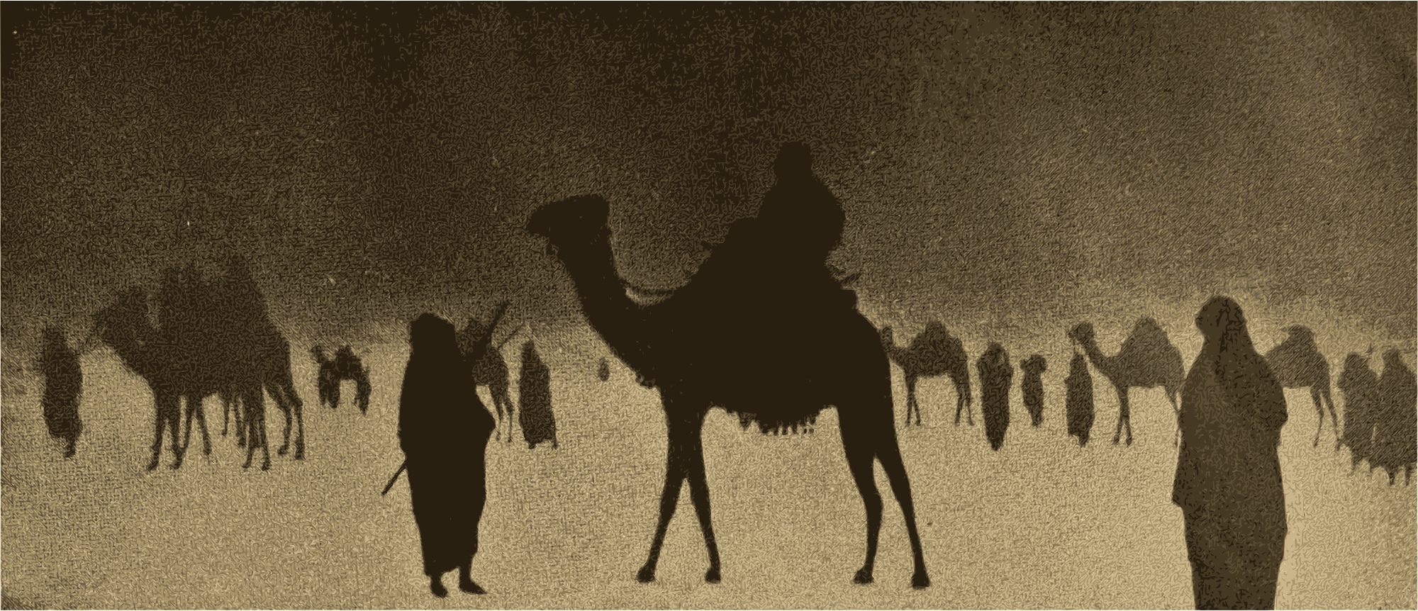 It looks like a bit of a sandstorm, but in any case you can see a bunch of guys with their camels in an endless desert. Not dessert though. Unless someone wants to eat a camel. Not a typical meal though I guess, although camel urine is a nice little treat if you are into that sort of thing. Wait, no I'm not joking. Camel pee and milk, yum yum. Hmm. Maybe I'm not thirsty anymore! But really. People drink that. Proof: