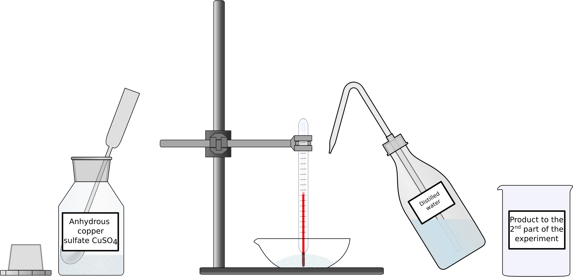 B.Lachner's drawing but with English labels. It is the first part of a well known experiment to demonstrate the reversibility of the reaction of water with anhydrous copper sulfate. Adding water in this part converts the white anhdrous copper sulfate to blue hydrated copper sulfate with the liberation of some heat, which can be demonstrated with an increase in temperature measured with the thermometer.