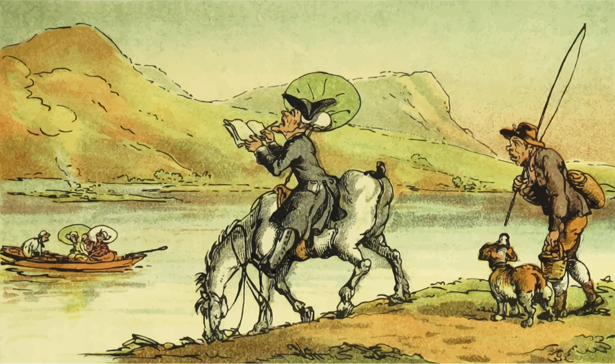 Not quite sure why this man doesn't get off his horse - it would be easier to make his drawing that way. A vectorization of a drawing in 'Doctor Syntax's Three Tours: in search of the picturesque, consolation, and a wife', William Combe, 1868. The drawing was entitled 'Doctor Syntax Sketching the Lake'. The raster image was processed to remove blemishes, and contrast and colours were adjusted before vectorization
