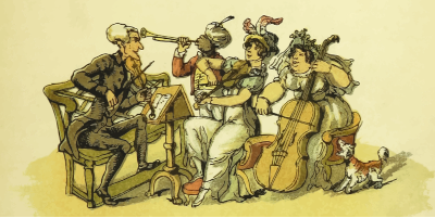 A lively quartet performs a piece with a dog accompanying on vocals. A vectorization of a drawing in 'Doctor Syntax's Three Tours: in search of the picturesque, consolation, and a wife', William Combe, 1868. The raster image was processed to remove blemishes, and contrast and colours were adjusted before vectorization