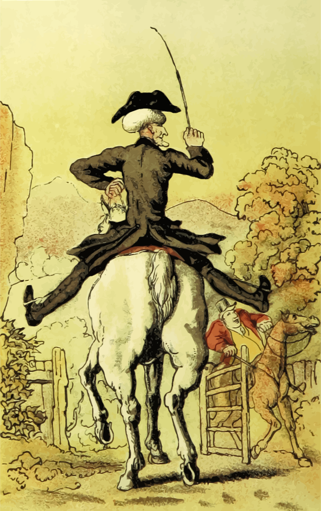 A man out riding in the country. A vectorization of a drawing in 'Doctor Syntax's Three Tours: in search of the picturesque, consolation, and a wife', William Combe, 1868. The drawing was entitled 'Doctor Syntax Setting Out in Search of a Wife'. The raster image was processed to remove blemishes, and contrast and colours were adjusted before vectorization.