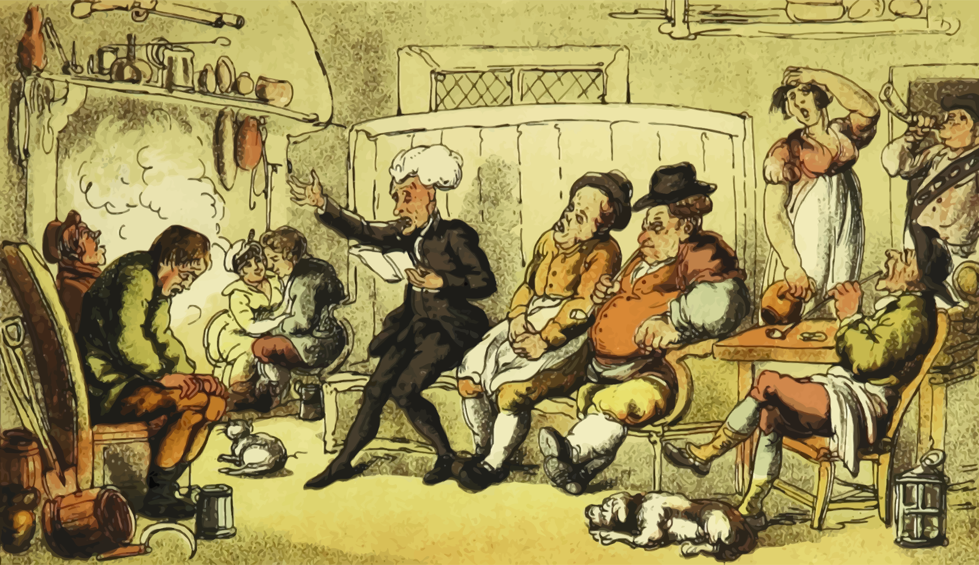 A man reads his poetry to an audience that appears less than gripped. A vectorization of a drawing in 'Doctor Syntax's Three Tours: in search of the picturesque, consolation, and a wife', William Combe, 1868. The drawing was entitled 'Doctor Syntax Reading His Tour'. The raster image was processed to remove blemishes, and contrast and colours were adjusted before vectorization.