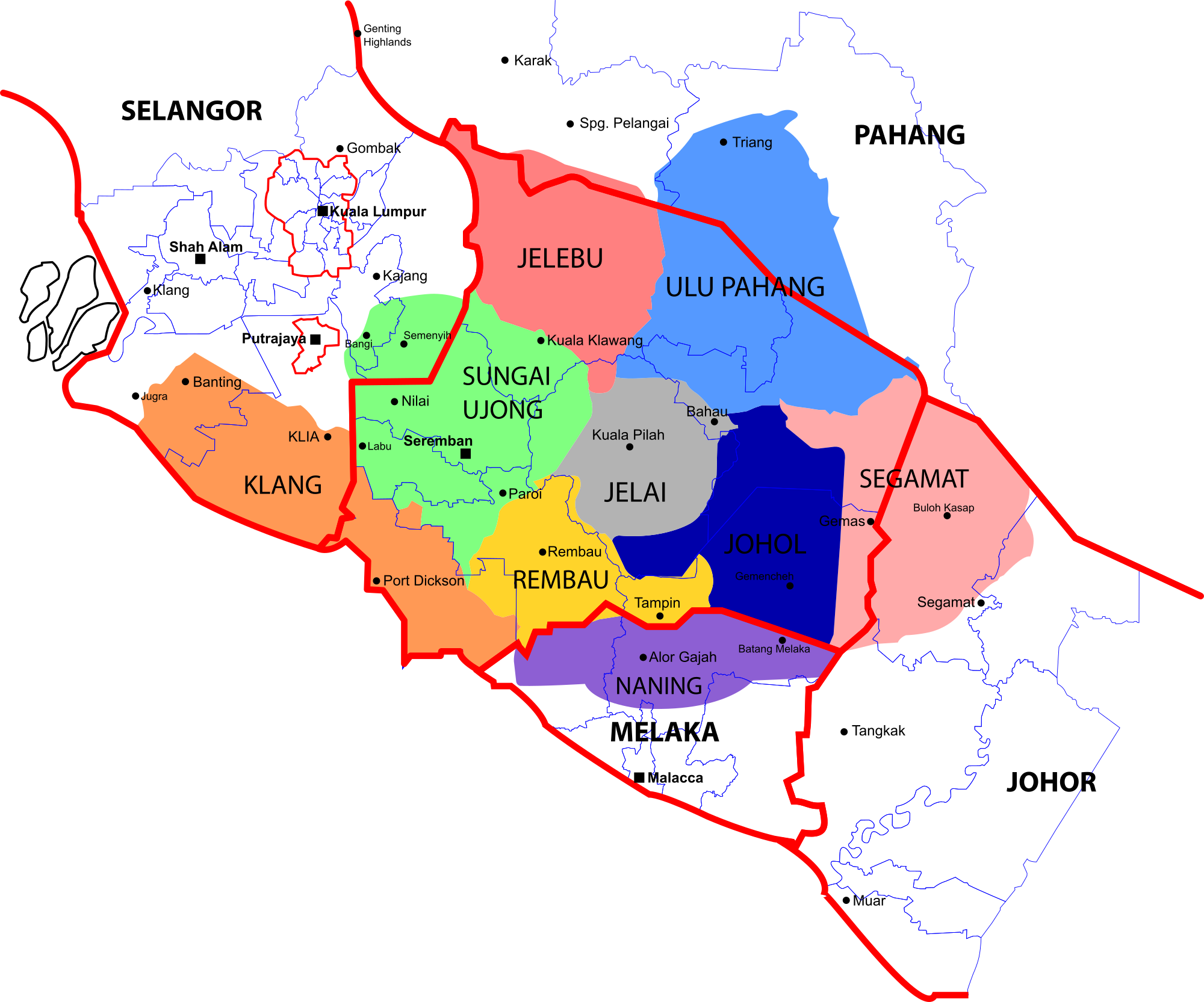 The nine original Minangkabau chiefdoms that make up Negeri Sembilan in the 18th century, superimposed on today's state and parliamentary boundaries.