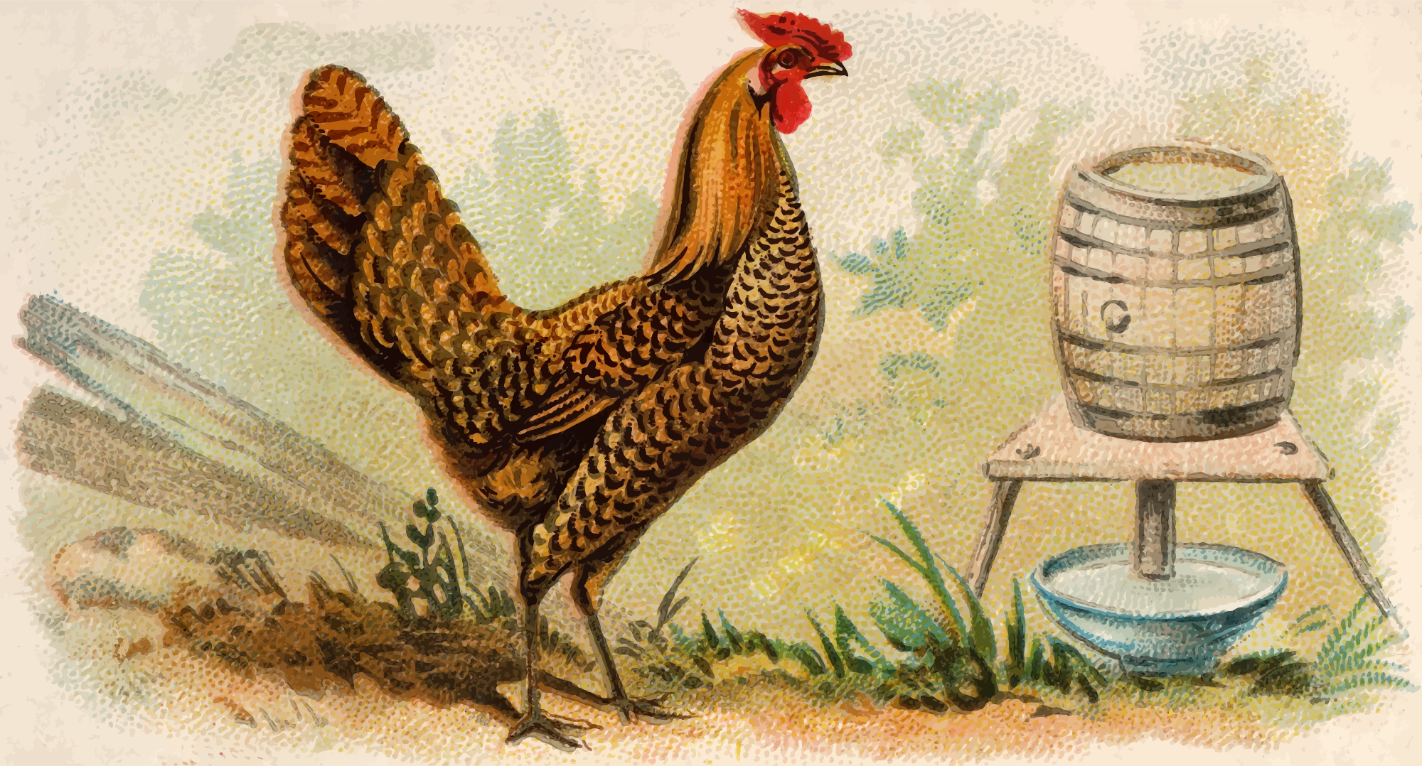 One of the "Prize and Game Chickens" series of cigarette cards from Allen & Ginter, late 1800s. Due to their age I have done a little restoration where needed and also cropped them to just the picture, adjusted contrast, brightness and colour saturation. The originals can be found on the New York Metropolitan Museum of Art web site.