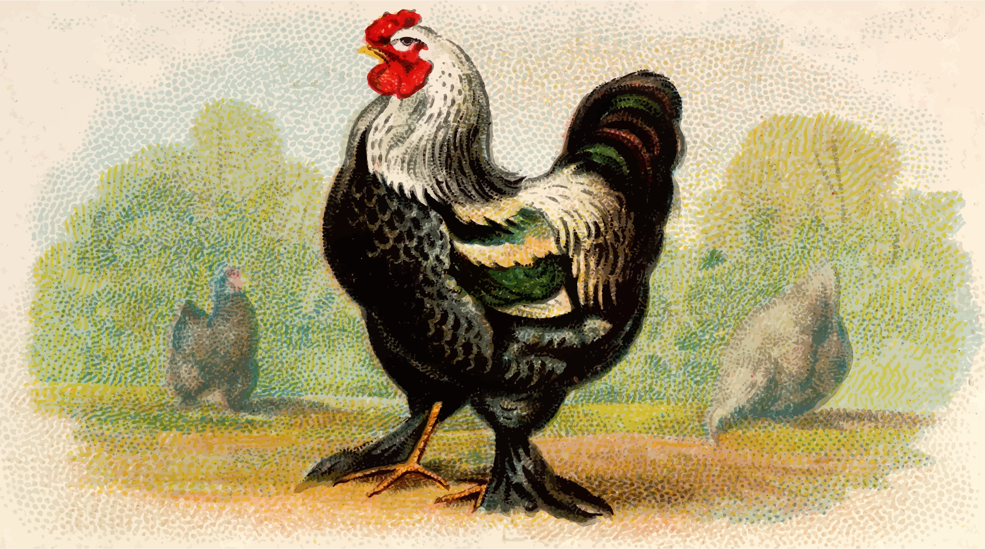 One of the "Prize and Game Chickens" series of cigarette cards from Allen & Ginter, late 1800s. Due to their age I have done a little restoration where needed and also cropped them to just the picture, adjusted contrast, brightness and colour saturation. The originals can be found on the New York Metropolitan Museum of Art web site.