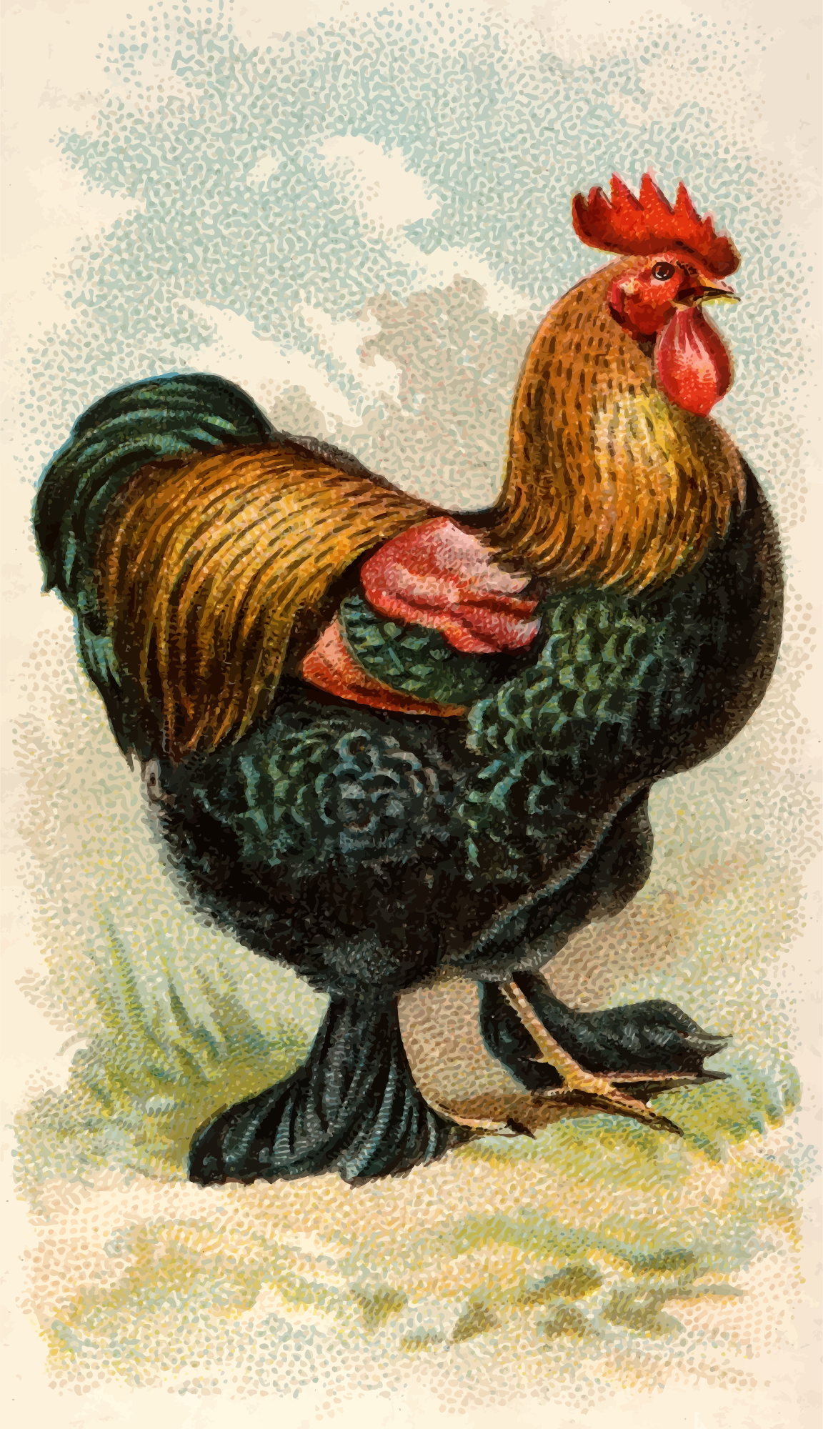 One of the "Prize and Game Chickens" series of cigarette cards from Allen & Ginter, late 1800s. Due to their age I have done a little restoration where needed and also cropped them to just the picture, adjusted contrast, brightness and colour saturation. The originals can be found on the New York Metropolitan Museum of Art web site.