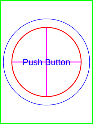 Vaishnav make push button. Red cutout dia 22.5 mm. Blue bezel dia 28 mm. Back side extension shown in green 30 mm x 40 mm. Pink cross mark may be required to locate centre for drilling purposes.