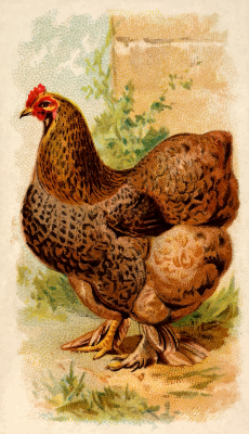 One of the "Prize and Game Chickens" series of cigarette cards from Allen & Ginter, late 1800s. Due to their age I have done a little restoration where needed and also cropped them to just the picture, adjusted contrast, brightness and colour saturation. The originals can be found on the New York Metropolitan Museum of Art web site.