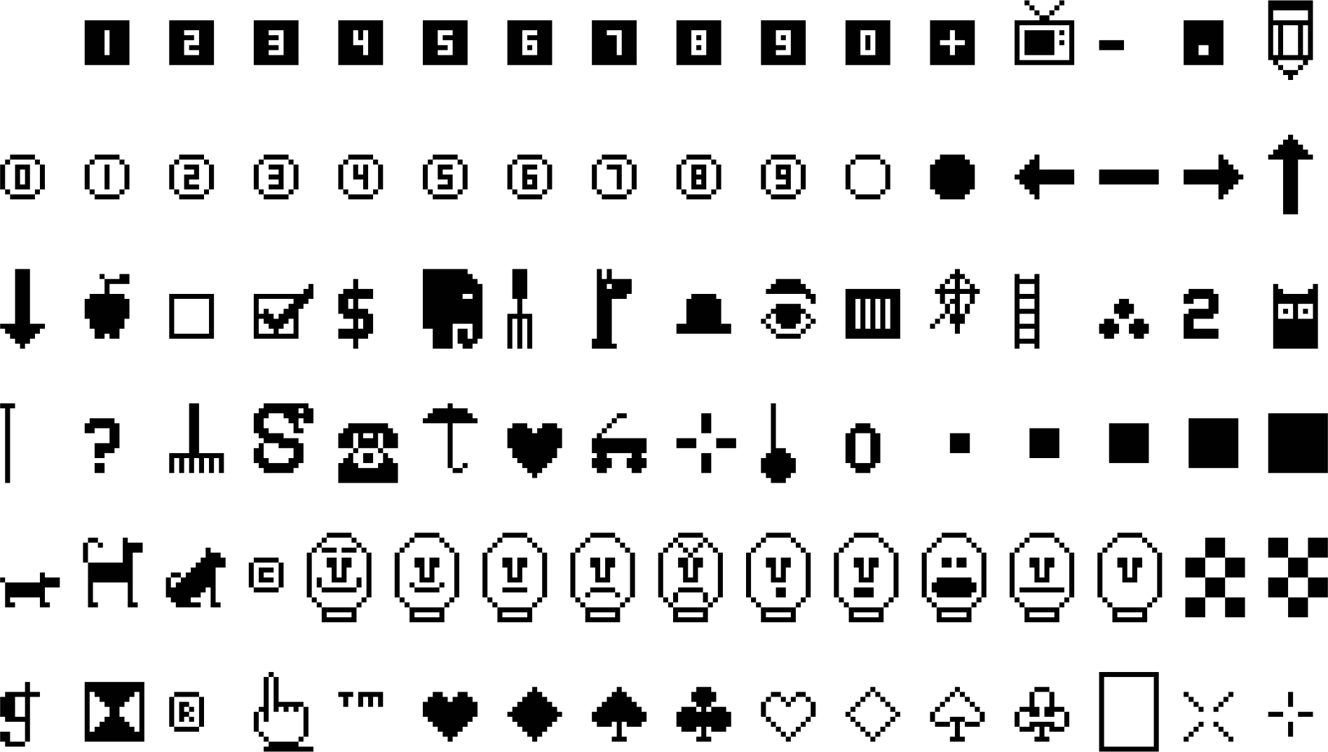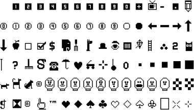 Retro style icons via the Widgets font from 'Apple Mechanic' (aka Shape Mechanic). Apple Mechanic, by Beagle Bros, was a shape table app for the Apple II line of computers. Shape tables are somewhat similar to hardware sprites. Beagle Bros folded in 1991 and their software was released as freeware in the mid 1990s.